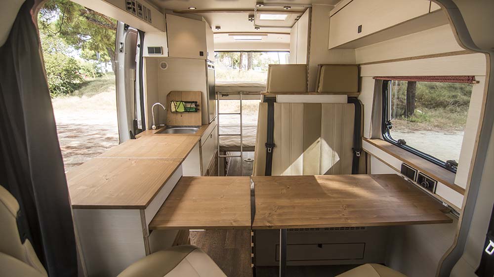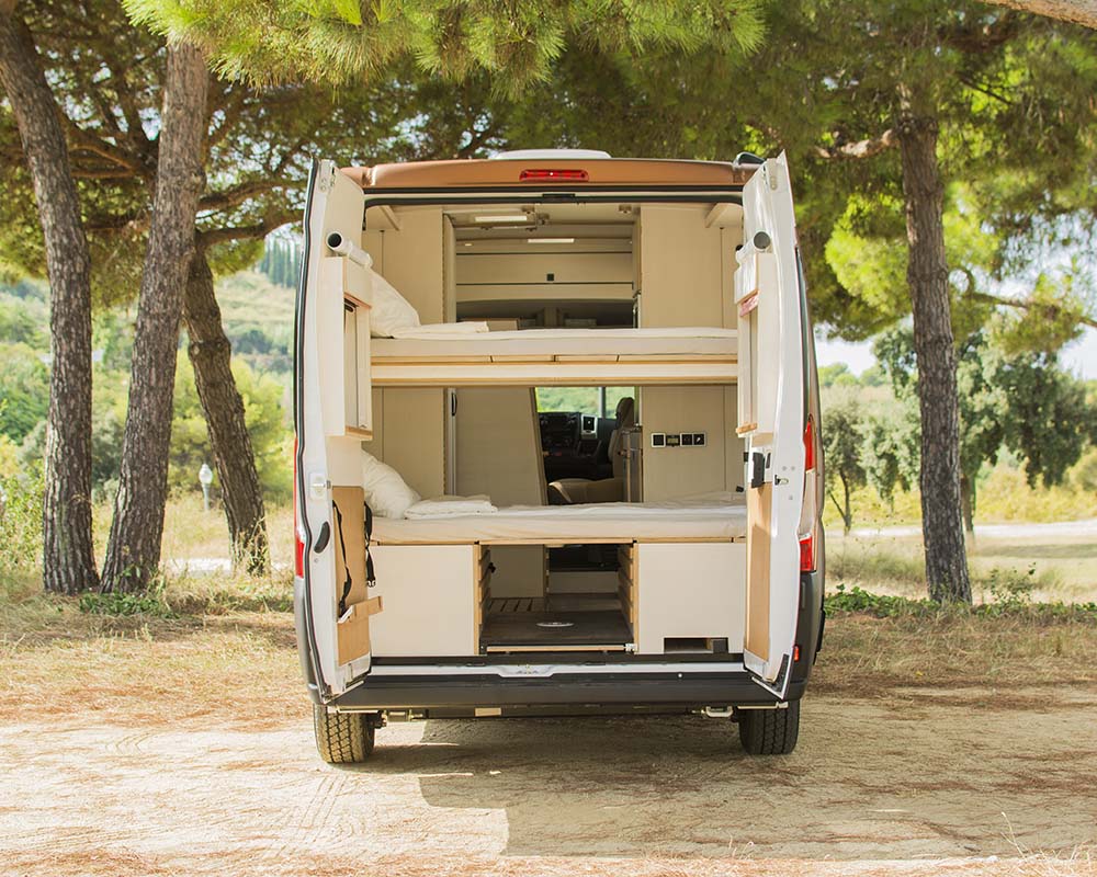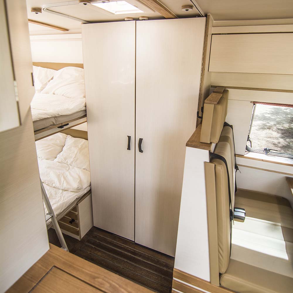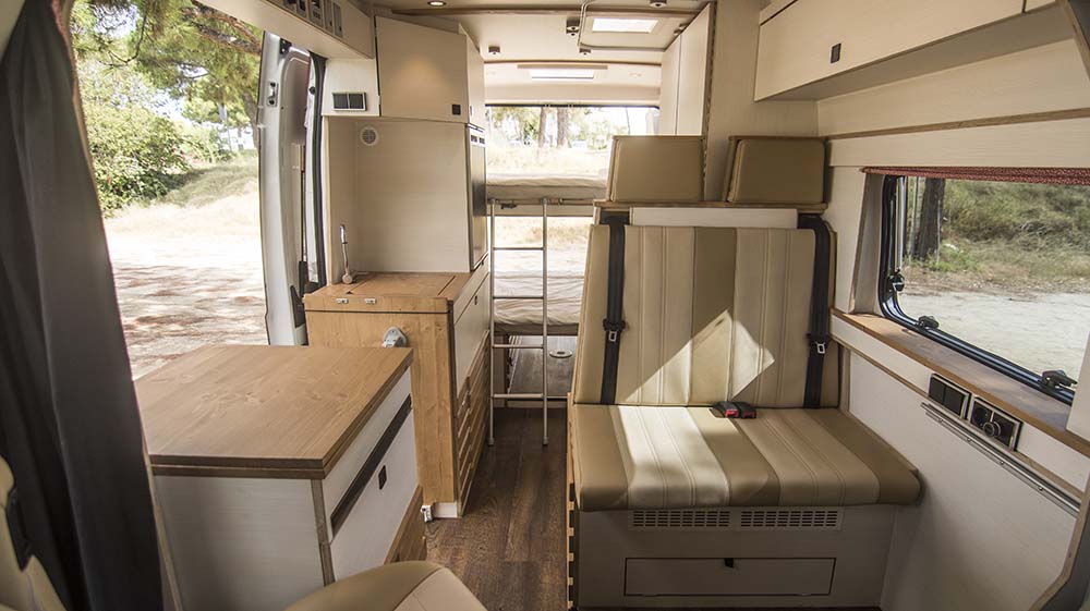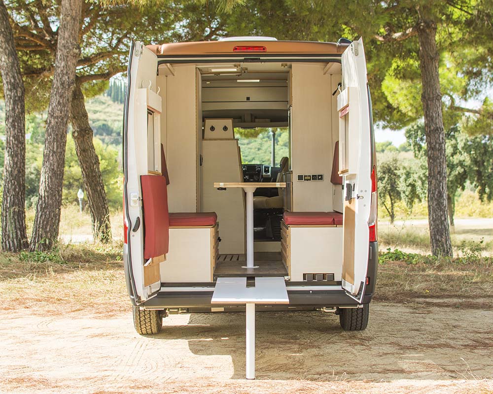 LAGUNA is like a small apartment on wheels. Very cozy and comfortable and with a lot of possibilities to create different spaces: the beds become a lounge, the shower disappears and the kitchen is also very flexible. However, it is still a camper with all the agility that goes with it. Great for those who want a little more comfort in their four-wheeled adventure.