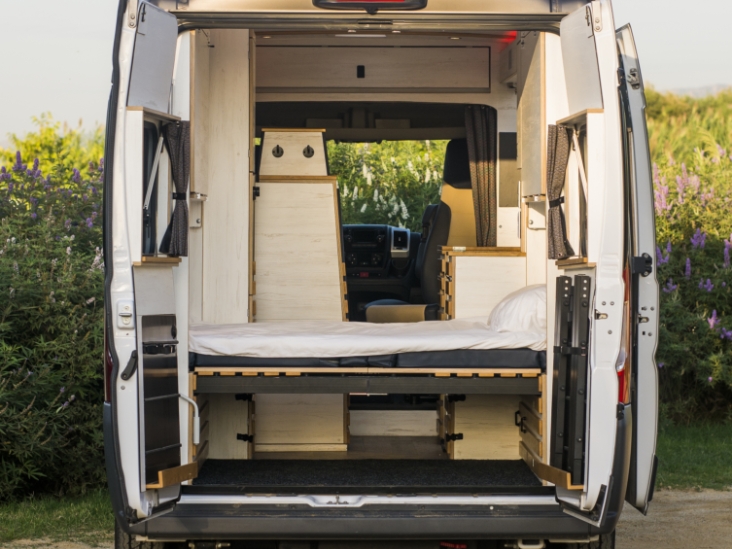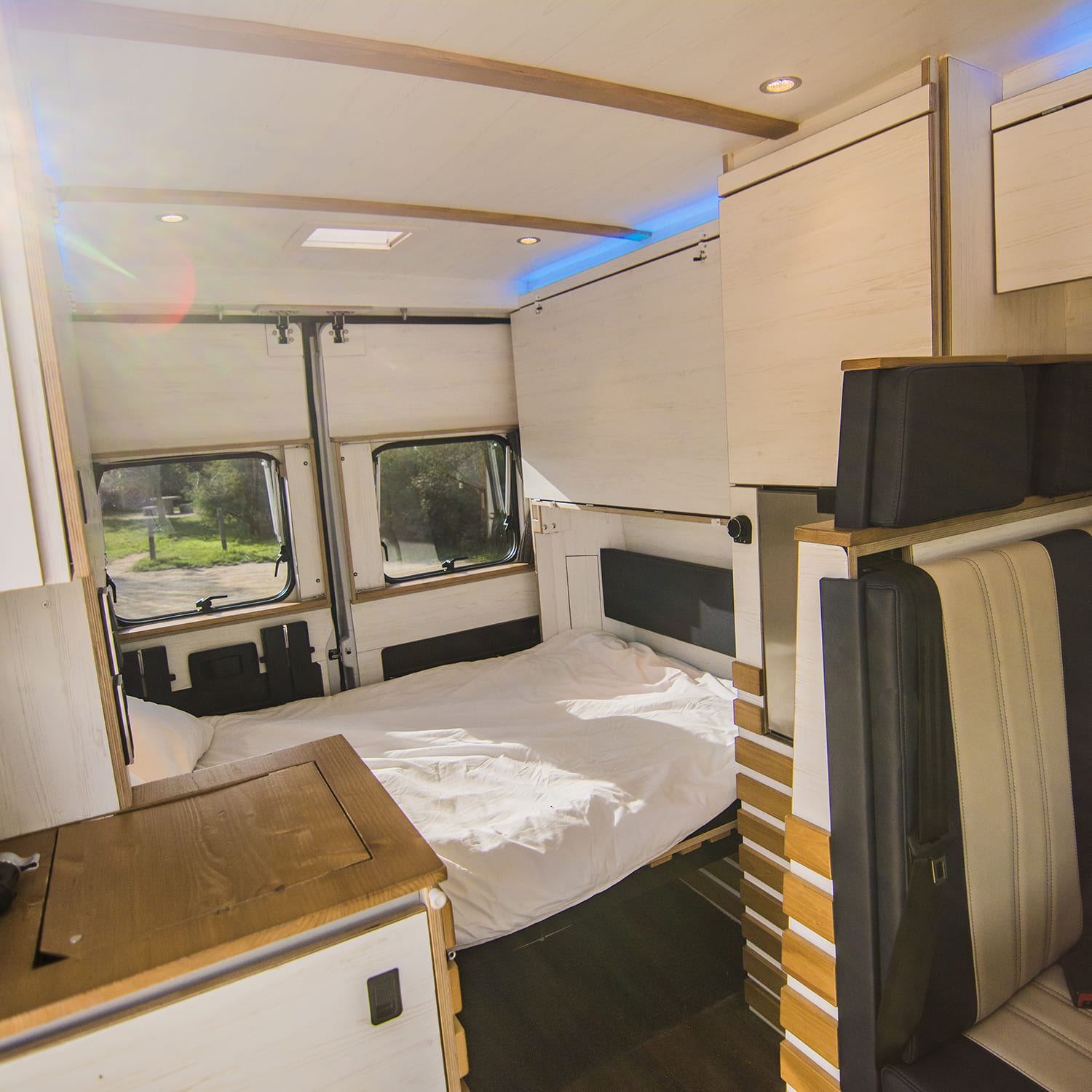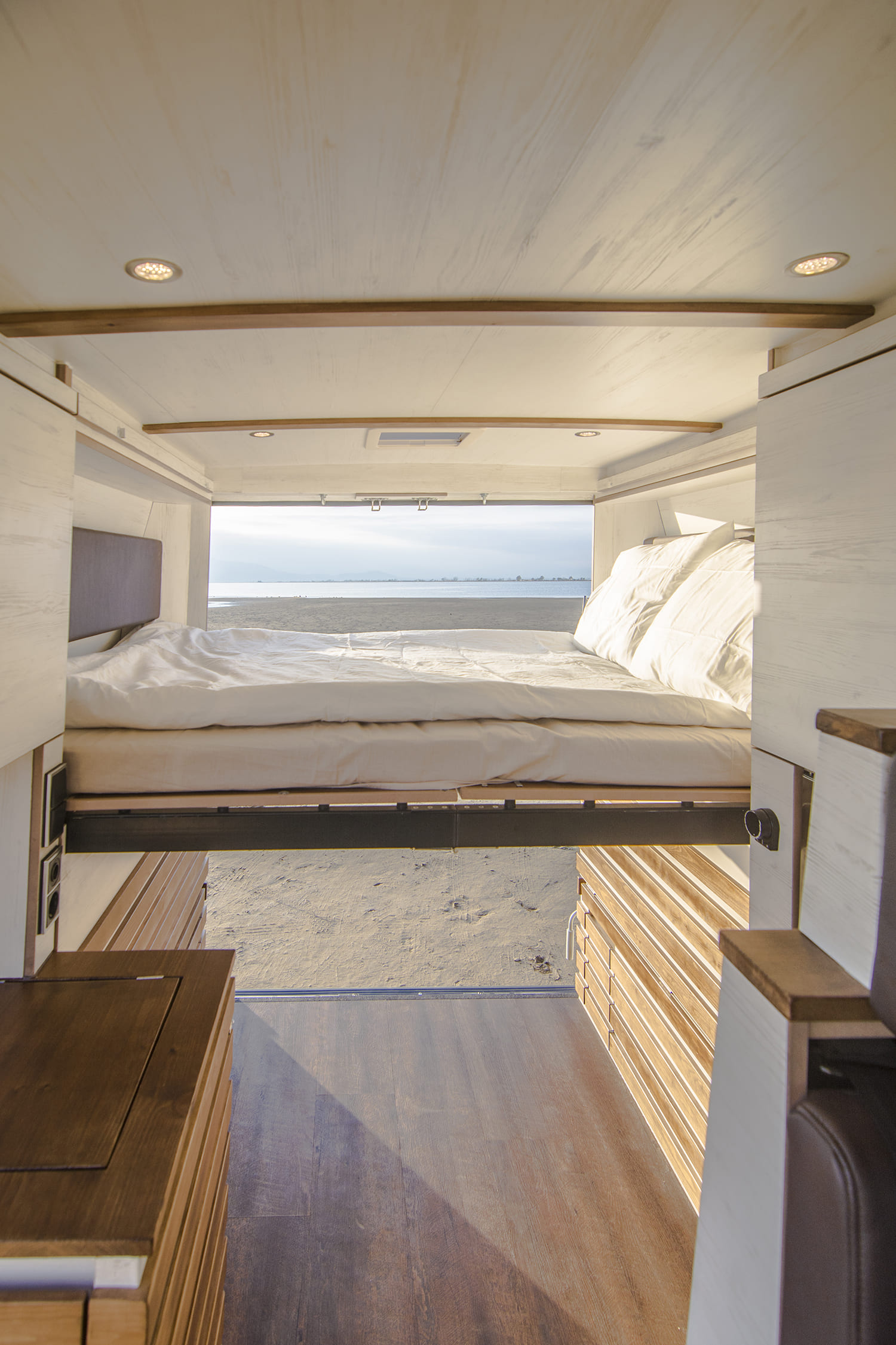 La SIERRA tiene dos camas dobles que se pueden abrir o cerrar independientemente para adaptar el espacio a los viajeros. Así pueden dormir hasta cuatro personas en la furgo, y si son solo dos pueden decidir si dormir arriba y aprovechar el espacio debajo de la cama o dormir en la cama de abajo y tener más espacio hacia arriba.
