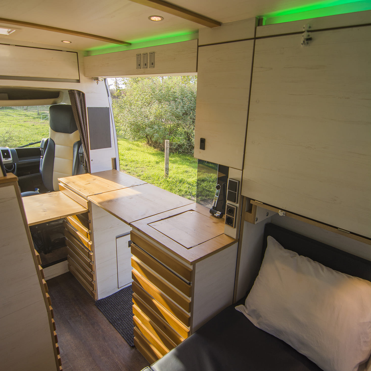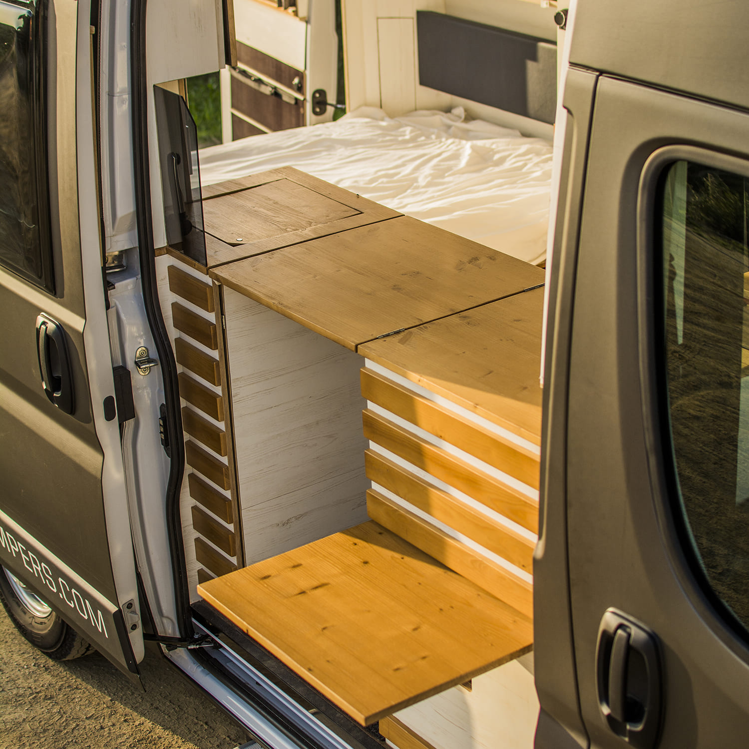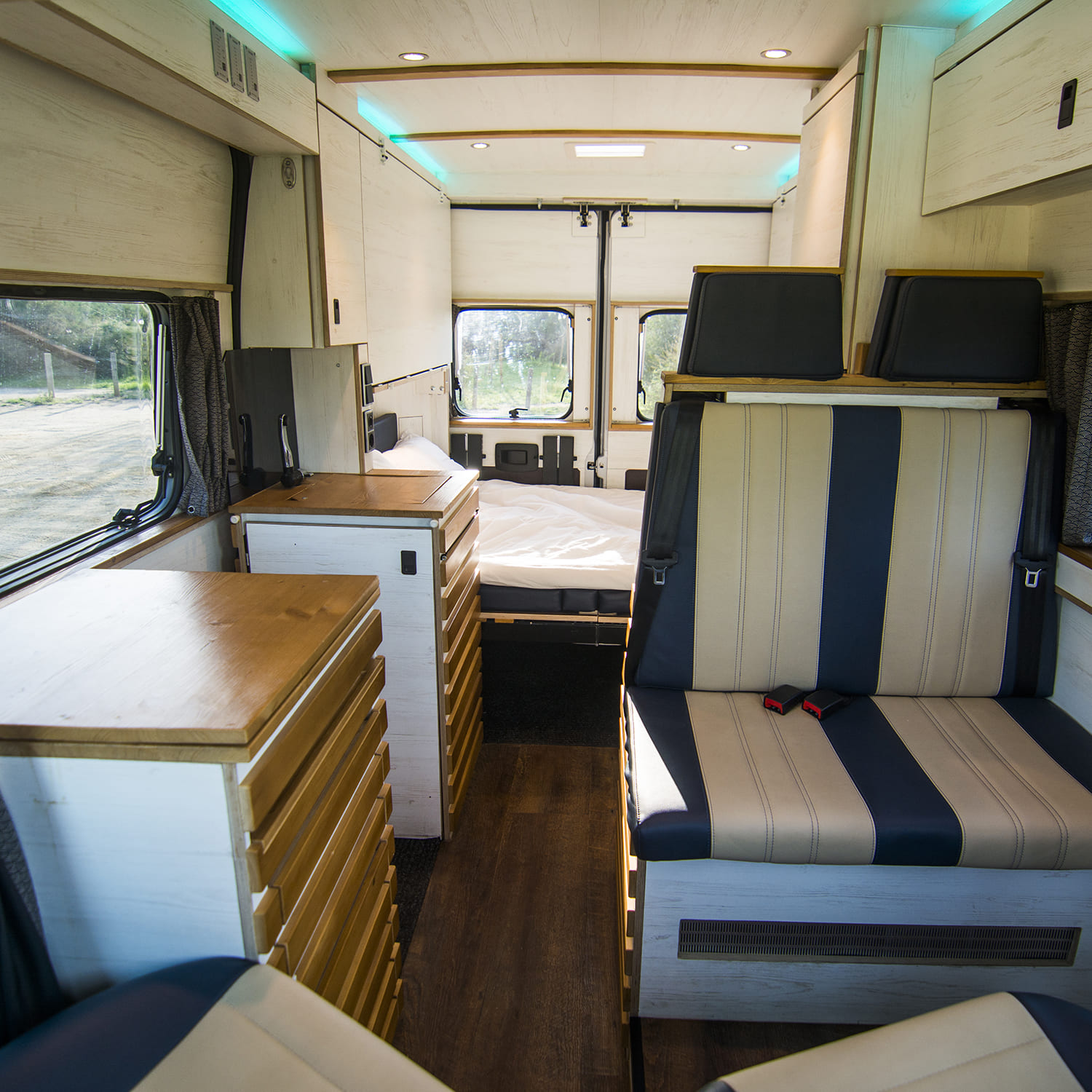 La SIERRA tiene dos camas dobles que se pueden abrir o cerrar independientemente para adaptar el espacio a los viajeros. Así pueden dormir hasta cuatro personas en la furgo, y si son solo dos pueden decidir si dormir arriba y aprovechar el espacio debajo de la cama o dormir en la cama de abajo y tener más espacio hacia arriba.