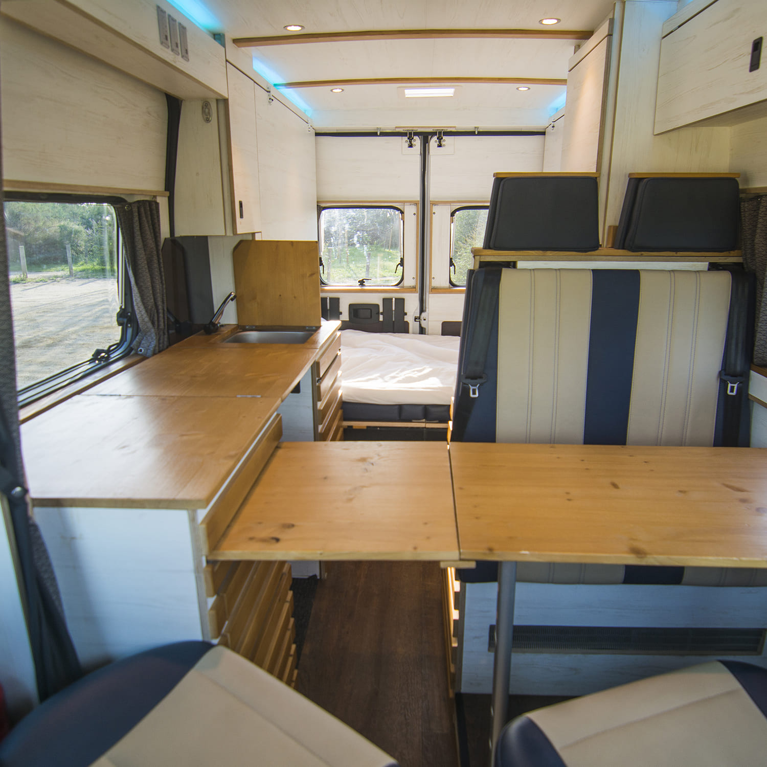 Se pueden girar los asientos para crear un salón con una mesa abatible entre el banco trasero y los asientos delanteros. También hay muchas superficies que podéis crear o esconder según el espacio que necesitéis en cada momento.